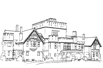 - crenellated towers and bay windows