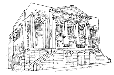 This building at 1600 Quadra (North Park), designed as the First Congregational Church in 1913, is a symmetric brick building fronted by two-storey Ionic columns supporting a wide frieze and a triangular pediment. Classical details are the modillions under the eaves and dentils on the cornice, and the three triangular pediments above the entrance doors.