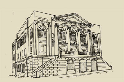 This building at 1600 Quadra (North Park), designed as the First Congregational Church in 1913, is a symmetric brick building fronted by two-storey Ionic columns supporting a wide frieze and a triangular pediment. Classical details are the modillions under the eaves and dentils on the cornice, and the three triangular pediments above the entrance doors.