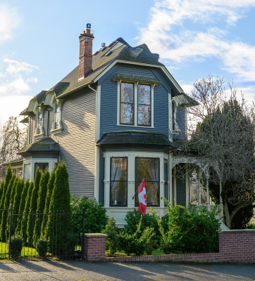 Stapleton was built in the Victorian Italianate style and is part of an important cluster of houses in the Upper Fort Street Heritage Conservation District. Its hipped roof has three brick chimneys and a flat area at the peak that likely once included a widow’s walk. The eaves are bracketed at the corners and above the windows. Small pedimented gables cap the front windows. The front façade is dominated by the angled four-window bay and balanced by the entry porch. Both have flat roofs and curved soffits. There is an impressive matching 2-storey bay capped with another small pedimented gable on the west side. These architectural elements are elaborately embellished with fretwork, brackets, rosettes and mouldings. The partially glazed front door has a transom window and sidelights. Exterior cladding consists of wide drop siding with corner boards, wide cornice and water-table. The tall windows are either 1-over-1 or 2-over-2 double-hung sashes with horns. The rear of the property, accessible from Meares St, includes a period garage with a sliding track door. The house was duplexed in 1955 and there are some additions in the back. Owners of the house in 1977 (Germaine and Ben Vivian) and 1992 (Green, Higinbotham & Claus) both won Hallmark Award for its restoration, as the house had deteriorated in the 15 intervening years. It is currently painted in a historically appropriate colour scheme and is used for professional offices.