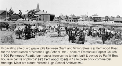 Within Section XVIII of Fernwood is the district known as Spring Ridge, bounded generally by Chambers Street on the west, Bay Street on the north, Fernwood Road on the east and Pandora Avenue on the south. Gravel deposits left after the retreat of the last Ice Age 10,000 years ago underlie this area. Numerous fresh water springs gave it its name. Until the damming of Elk Lake in the early 1870s, these springs were the principal source of drinking water for Victoria. One of the most important springs was on the 1100-block of Princess Avenue. At first, water carriers filled their wooden casks there and sold it door to door throughout the city. Later, wooden stave pipes were used to carry the water to town. At least two breweries (the Lion and the Empire) were established in the vicinity to take advantage of the pure water. Though the springs remain in many basements and backyards, most have been capped, and the water has been diverted into Rock Bay through a drainage system built specifically for the purpose in the 1950s.