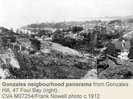 Expansion of the area’s roadways – however rustic – allowed subdivision of the founding estates to begin as early as 1861. The waterside properties near Point Ellice attracted some of the first newcomers, notably Charles Wallace who married Catherine Work fro